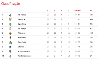 E como não podia deixar de ser o primeiro comentário vai para a classificação geral do nosso campeonato, em que os três grandes (como jornalistas e comentadores gostam de lhes chamar) se batem como feras para não perder o lugar. O primeiro quer continuar a ser primeiro, o segundo quer roubar o lugar ao primeiro e o terceiro anseia por ultrapassar os os dois que seguem na sua frente, embora sinta que as coisas não nada fáceis. Eu, como benfiquista ferrenho, estou convencido que o Benfica tem boas hipóteses de derrotar o Porto, quando em meados de Abril o receber na Luz. E, lá mais para o fim do campeonato, garantir pelo menos um empate com os leões, em Alvalade. E se assim for, lá estaremos no Marquês a festejar o Penta.